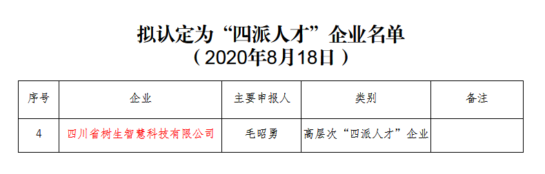 2020年8月18日,成都市高新区科技和人才工作局发表《关于拟认定为"四派人才"企业名单的公示》,四川树生智慧科技有限公司成功入选该批次高层次"四派人才"企业名单!