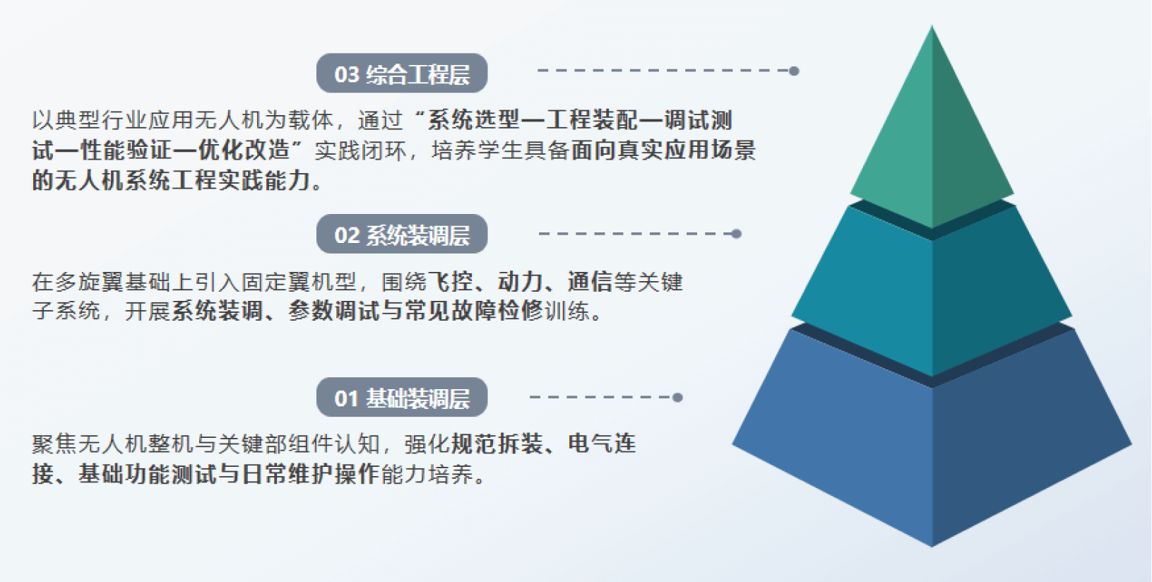 方案以国家相关标准和行业岗位要求为基础,围绕无人机装配、调试、检修与工程应用等关键教学环节,构建"基础装配—系统装调—综合工程"三层递进式实训体系,逐级深化无人机从零部件装配、系统级装调与故障检修,到面向典型行业场景的系统集成与工程优化能力培养,满足不同院校、不同专业阶段的建设需求。